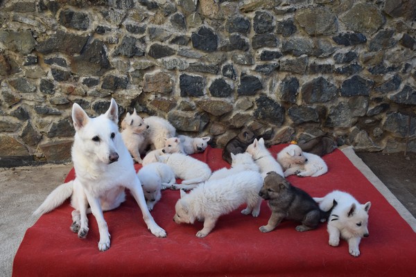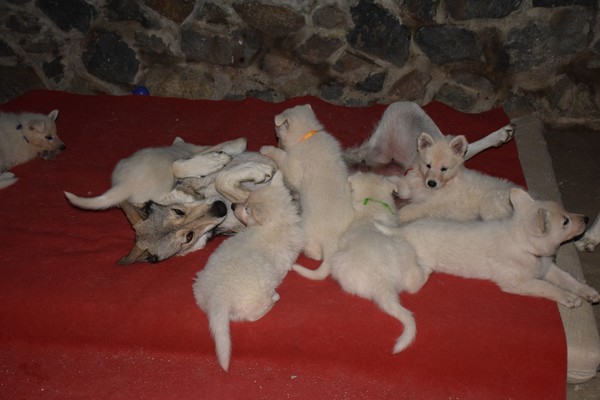 26.9.2018 U nás je to prostě jedna velká rodina :) Elitka se rozhodla, že bude kojit nejen své vlčky, ale i Enny bílé děti :), takže kojí všech 15 štěňat jako kdysi před necelými 3 lety když měla Elita a Hope společně štěňata a Hope kojila všech 15 štěňat :). Prostě jak říkám : jedna velká rodina :).